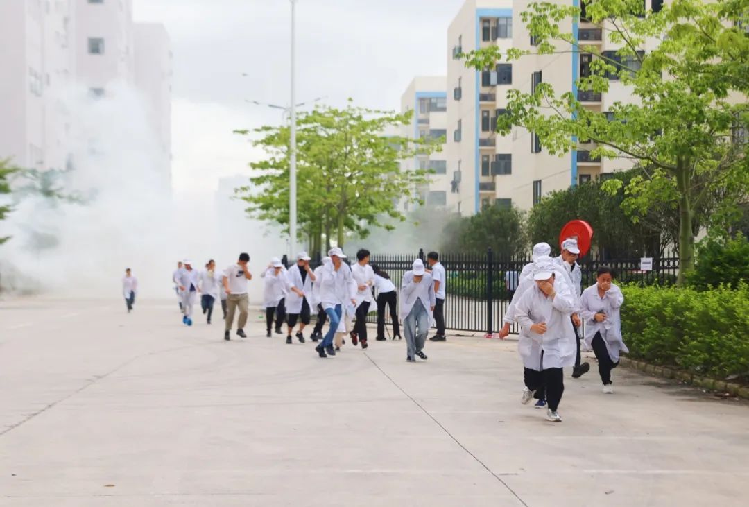 “报告!5#厂房4楼储存仓库因电池突发异常引发火灾,火势正向北面蔓延,燃烧面积约150平方米,两名员工被困!”演练现场,模拟灾情通过企业监控系统实时传输至应急指挥部。中山比亚迪电子有限公司立即启动应急预案:喷淋系统与排烟设施同步启动,声光报警器响彻厂区,隔离疏散组引导员工沿消防通道有序撤离至安全区域;微型消防站6名消防员和企业志愿消防员携带装备直奔火场,先行使用灭火器对燃烧电池组进行压制,并使用灭火毯覆盖起火电池箱转移隔离,利用就近消火栓喷出2支水枪形成防线,遏制火势蔓延。从报警到初期控火,企业应急小组分工明确、行动迅速,充分展现了“第一响应人”的处置能力。